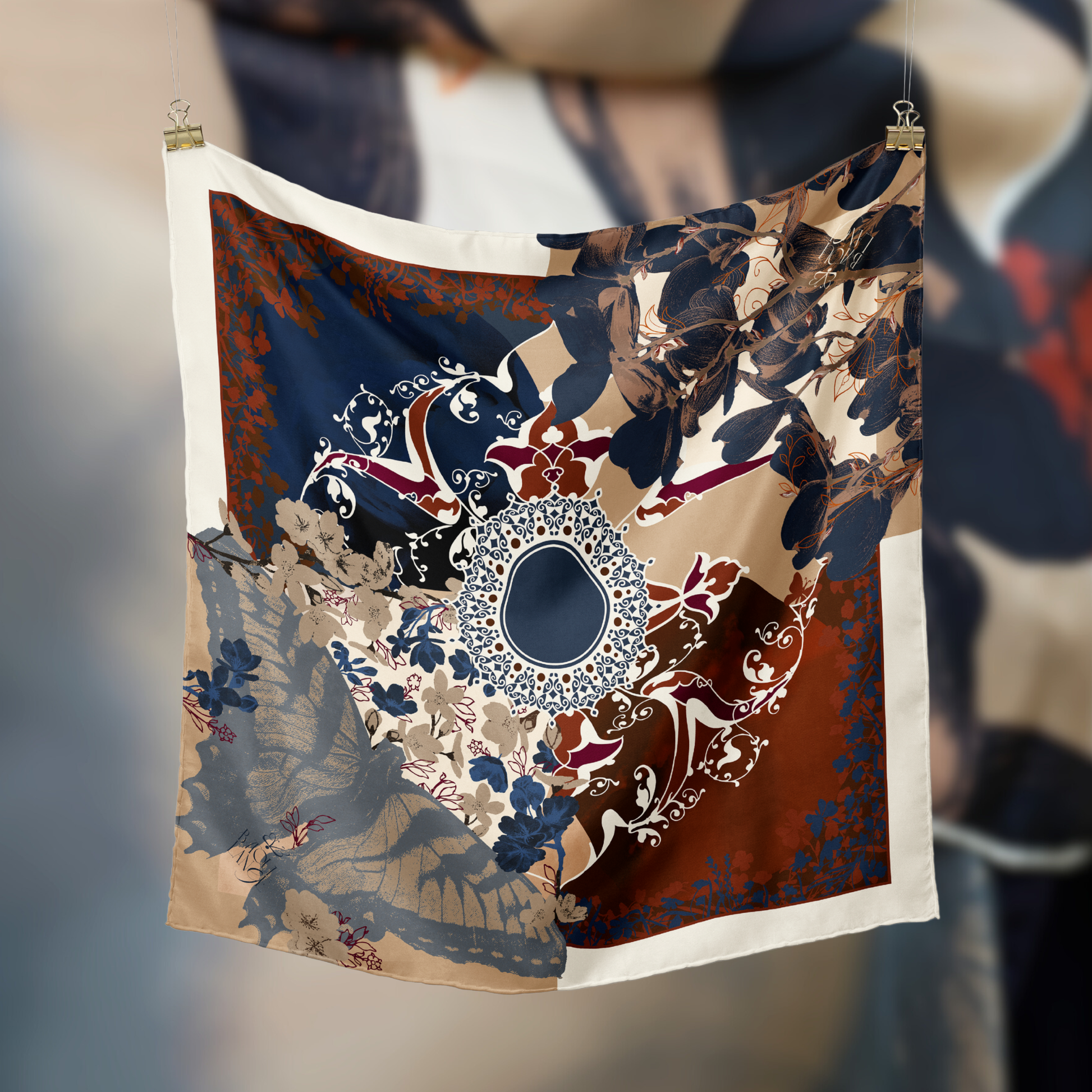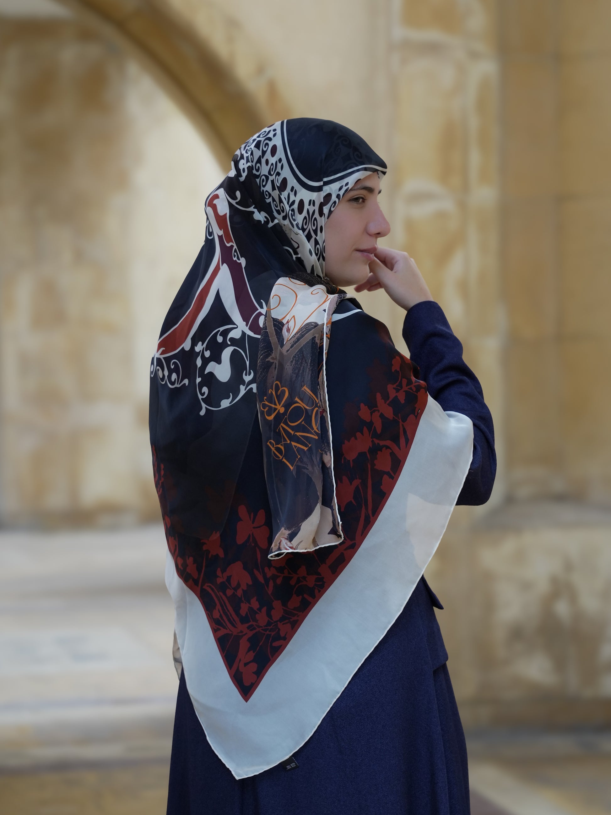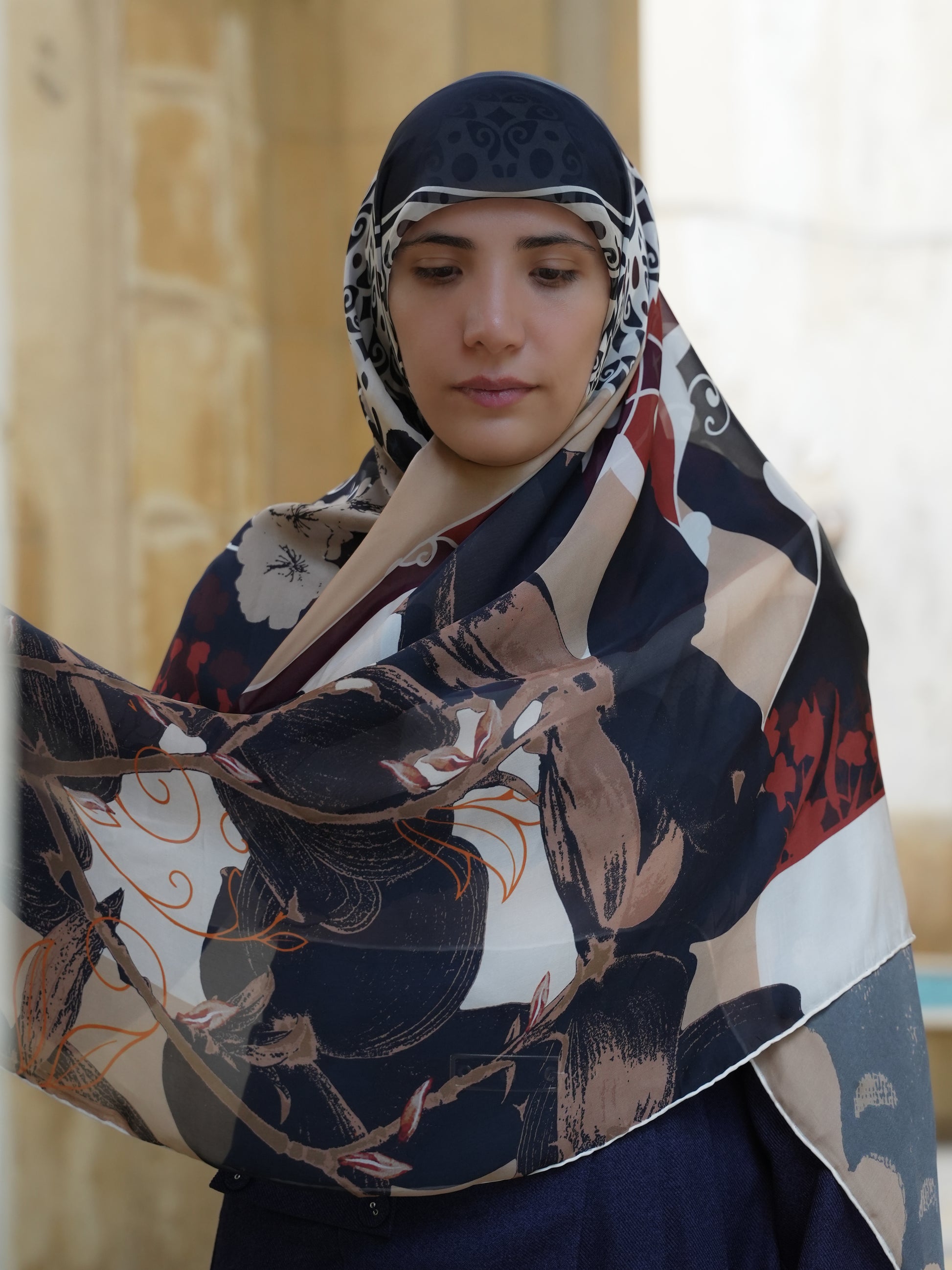 Usul in AMINAH is navy like never before. This elegant scarf features navy with shades of white, beige and deep burnt orange.