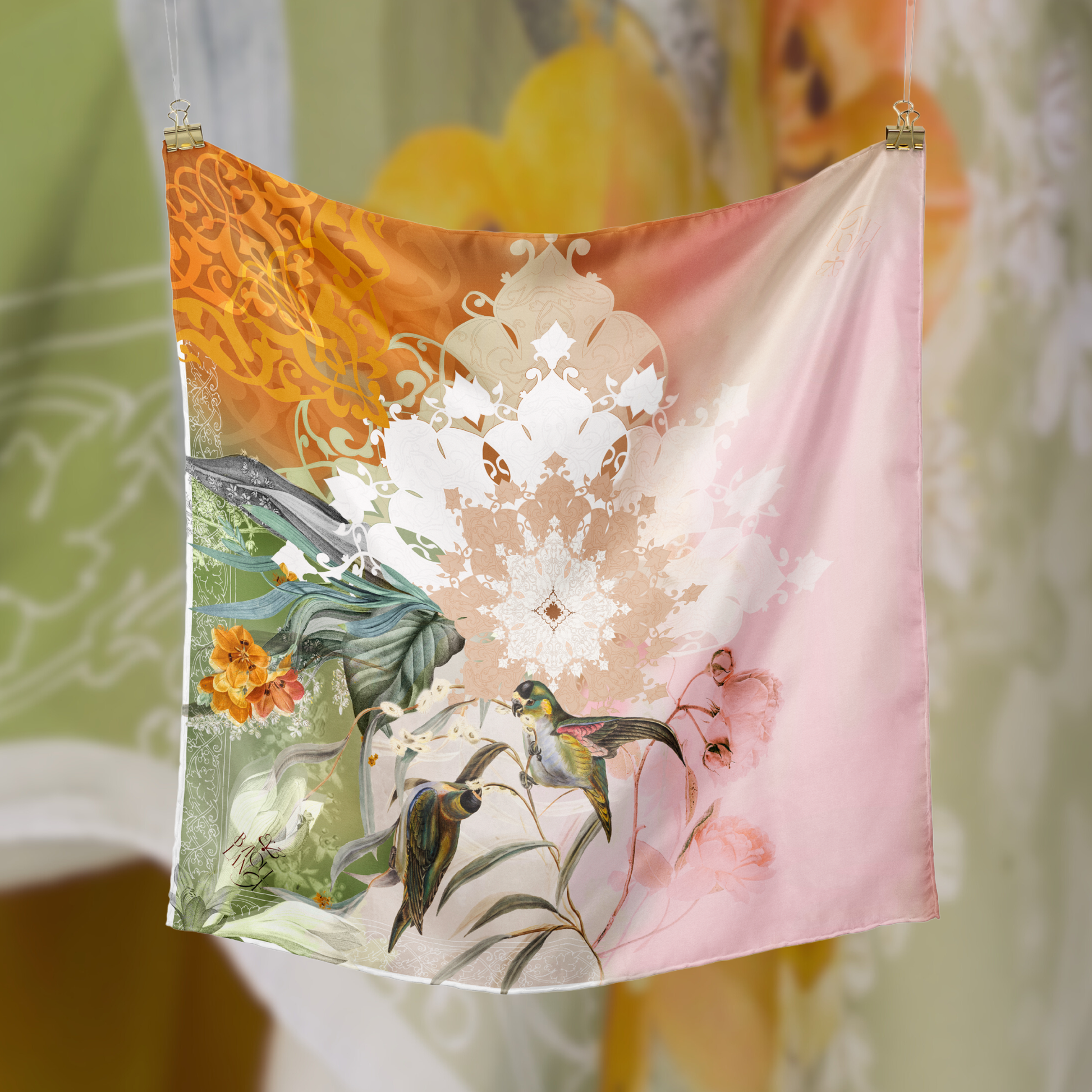 Eden in FOREST accentuates warm, earthy colors with a hint of bold orange, and soft pink hues. Made with the finest silk, this scarf captures the essence of nature in its every fold. It features four different faces, for endless styling possibilities.