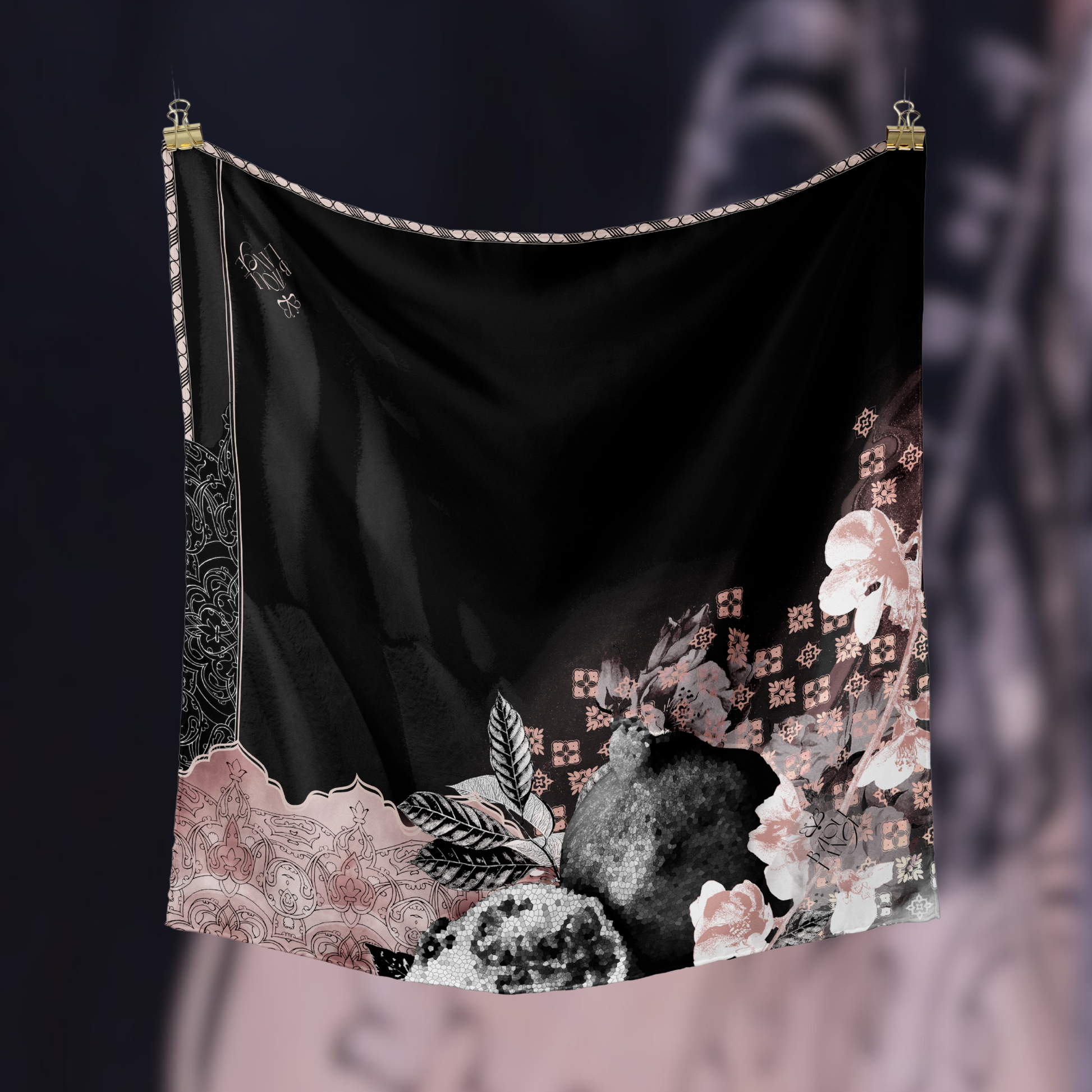 Anara in PEARL is black elevated with shades of gray and beige. Made with the finest silk, this scarf takes the elegance of black to new heights. It features four different faces to meet all your styling needs, from plain to print and everything in between.